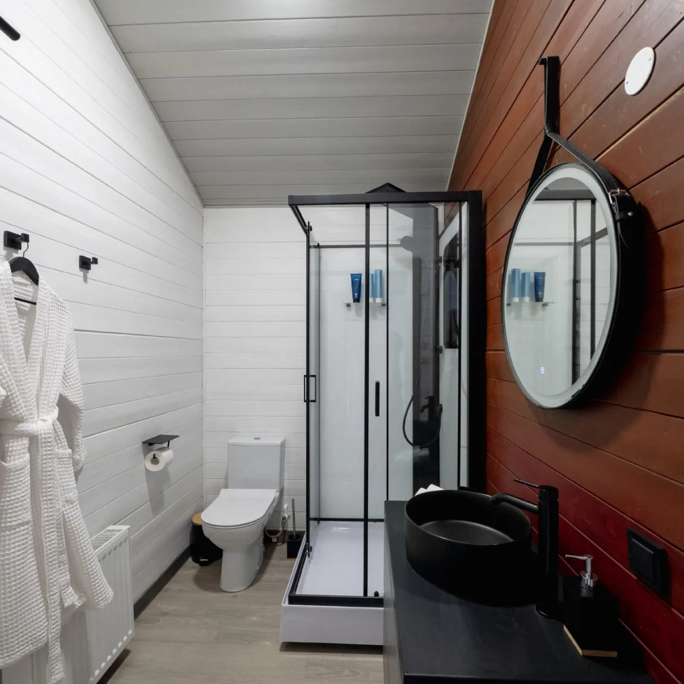 Ванная комната с душевой кабиной и санузлом